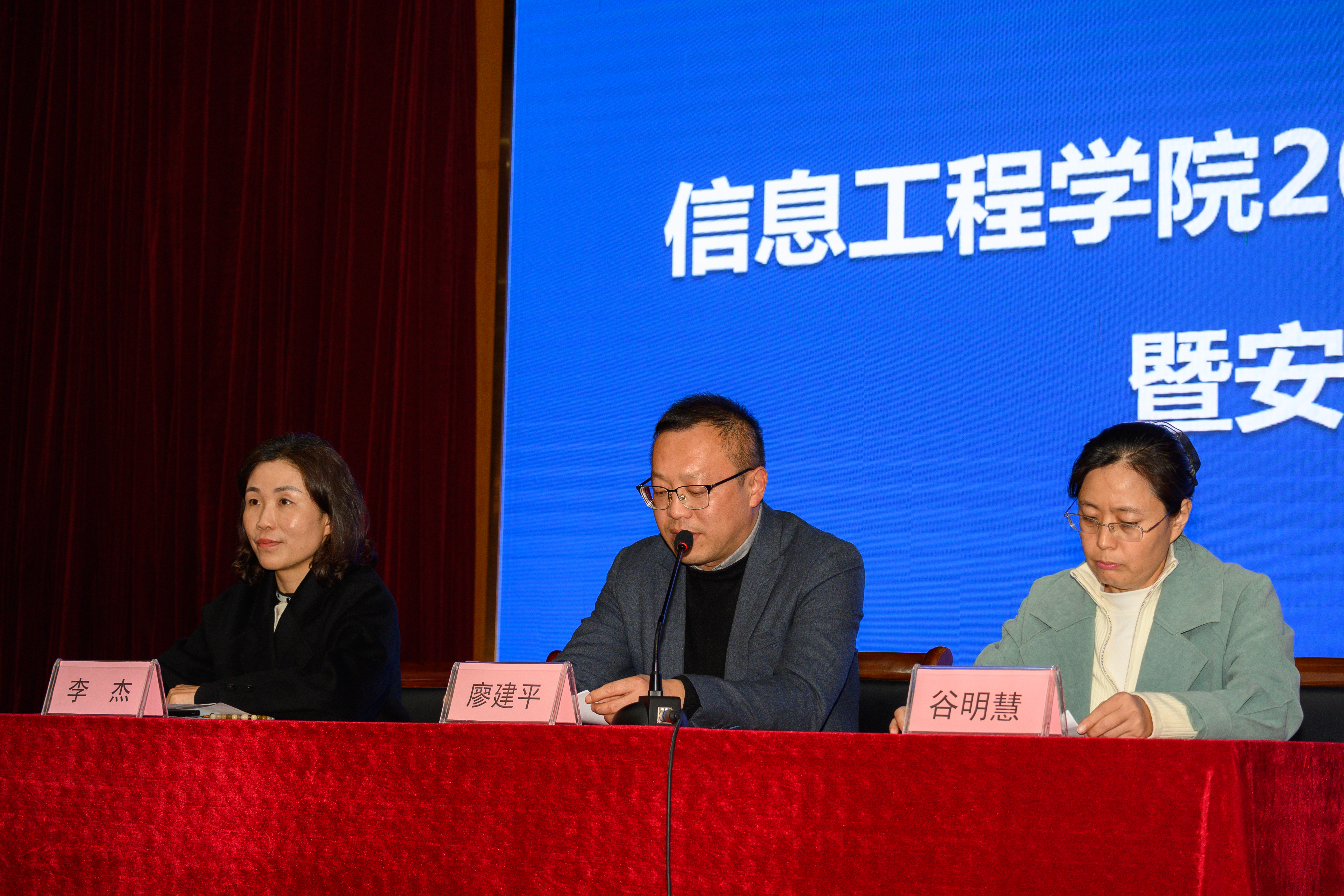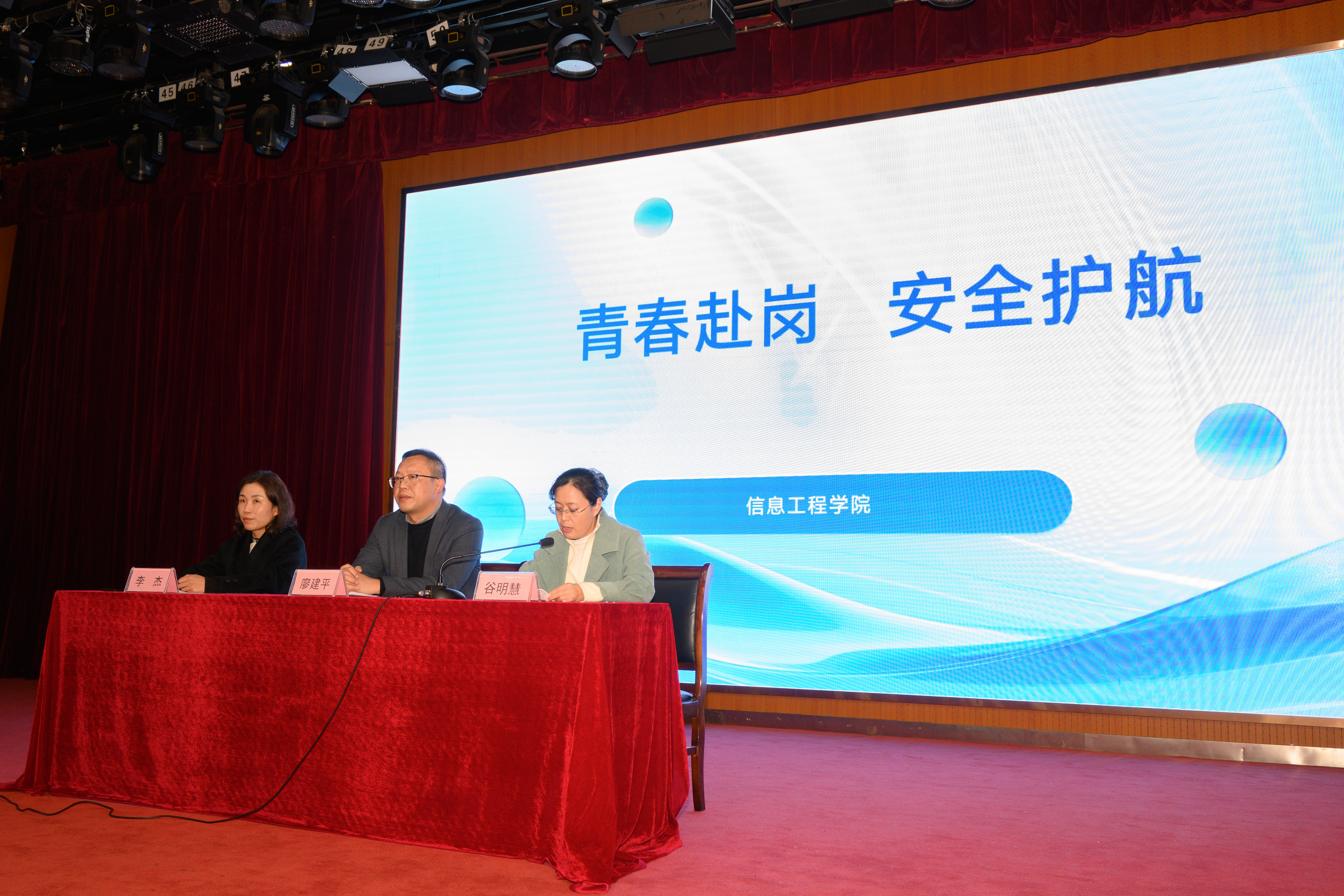 为切实做好2026届毕业生实习工作,明确实习要求、强化安全意识,帮助学生平稳有序开启职场第一步,11月21日下午,信息工程学院在图书馆1号报告厅分两场召开2025年下半年实习动员暨安全教育大会。学院党总支书记廖建平、副书记谷明慧、副院长李杰,各毕业班班主任、联络辅导员及2026届毕业生共同参会。