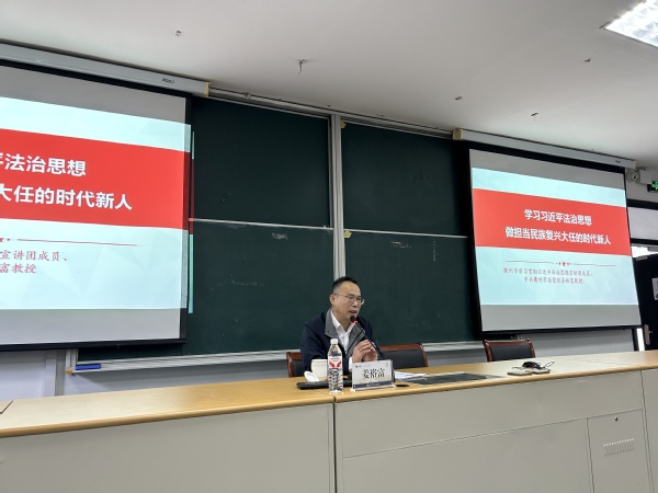 习近平法治思想是全面依法治国的根本遵循和行动指南,为深入学习习近平法治思想,全面贯彻落实党的二十届四中全会精神,进一步引导青年学生树立法治信仰、增强法治素养,11月19日法务与规划发展处(职业教育研究所)组织开展了习近平法治思想主题讲座。衢州市学习贯彻习近平法治思想宣讲团成员、中共衢州市委党校姜裕富教授担任主讲90余名新生代表参加。